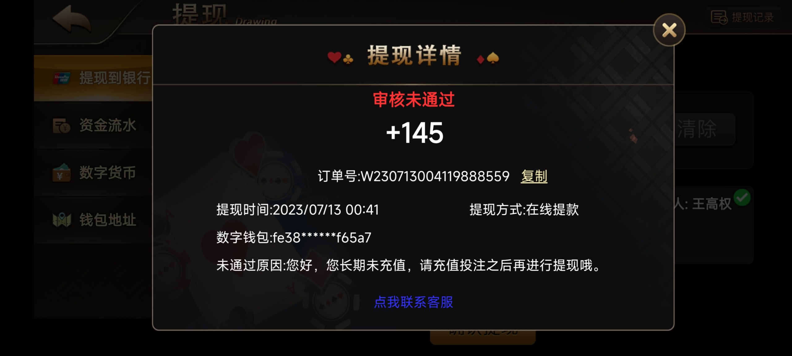 领取了24打到145提现叫我充值一笔充值了上500直接黑了