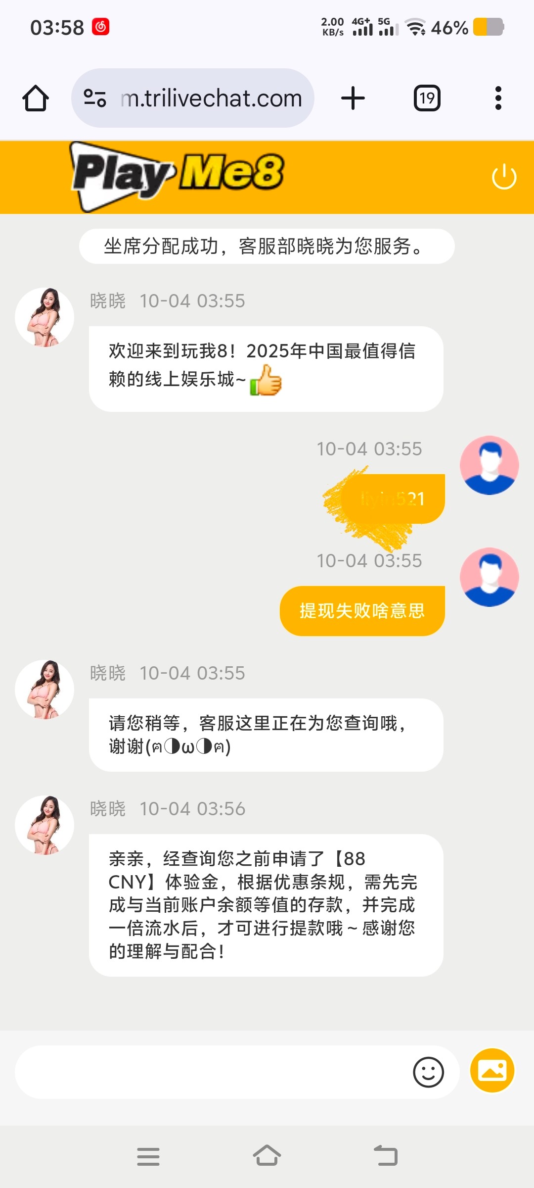 电话特邀送了88,要十倍流水,打了半天结果要充等额,这模板还是第一次见,不过客服模板看着黑,有没有老哥出过