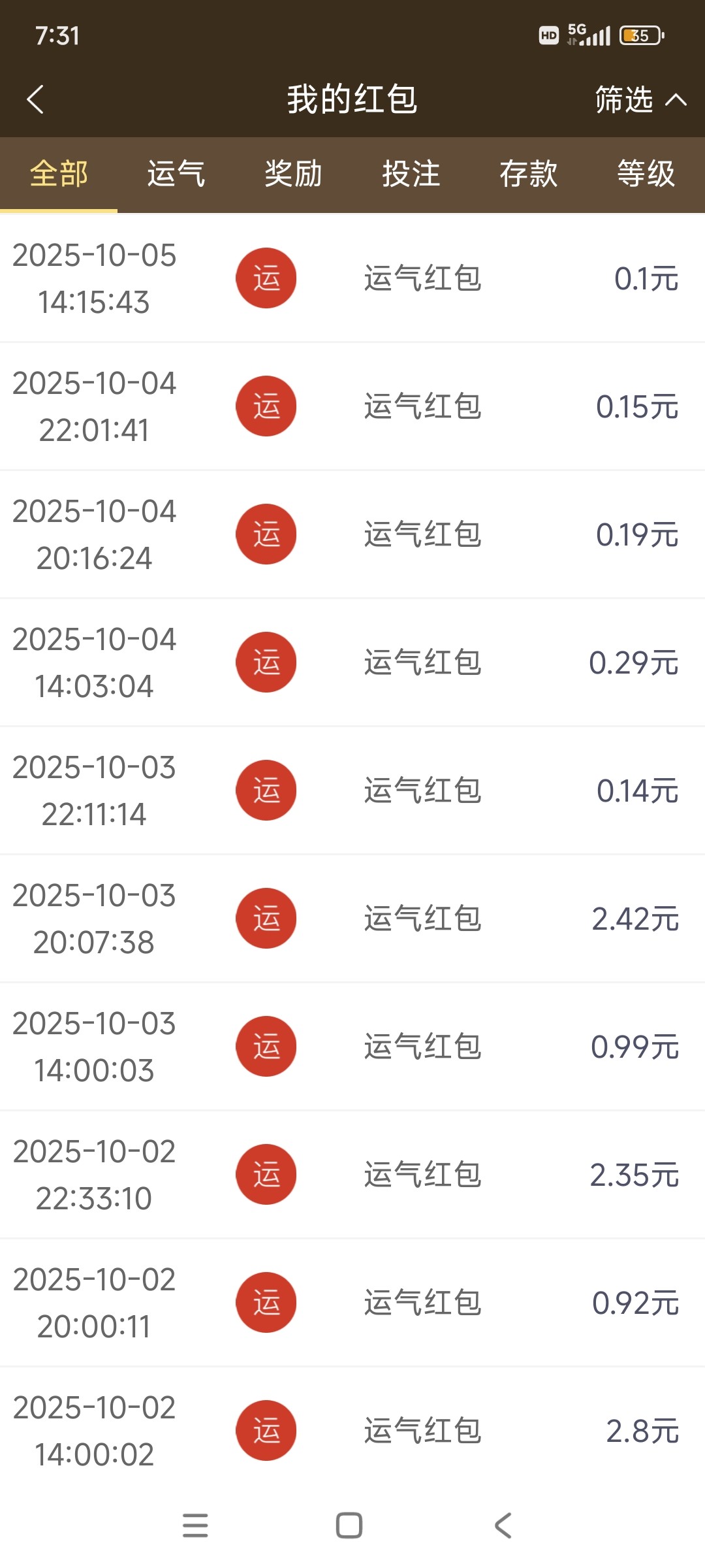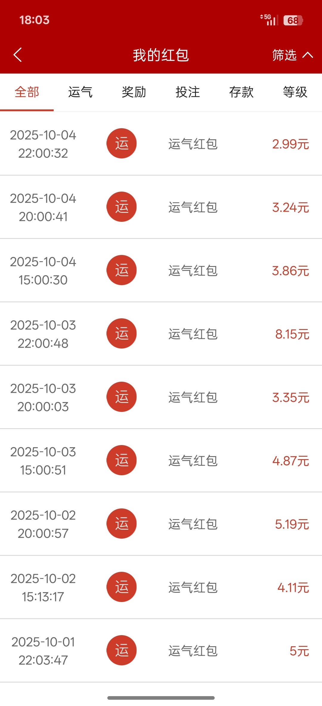 你自己倒霉吧,我三块五块这样子,然后偶尔一两块,有节日一半都是六块九块这样