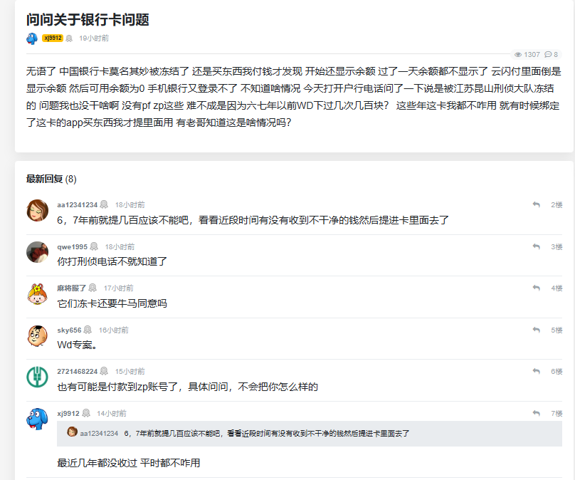 刚看到有老哥发帖,6-7年 没用wd提现过,正常支出一样被冻结了,真离谱啊,那我wd提过的卡意思是现在不能放钱呗,随时有冻结的风险?